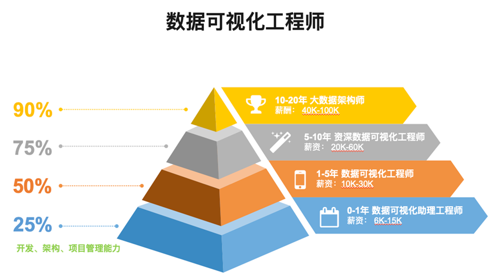 3) 相比传统程序员,大数据开发工程师除了需要熟悉JAVA/PYTHON开发语言、关系型数据库和应用服务器以外, 还需要熟悉分布式下的关系型数据库服务、离线分布式计算平台、云计算提供的ECS服务等。 - 数据可视化工程师画像